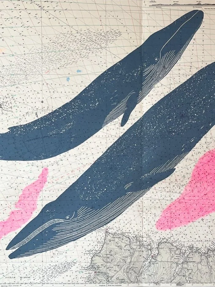 This is an original unique handmade silkscreen print onto a found vintage sea chart.